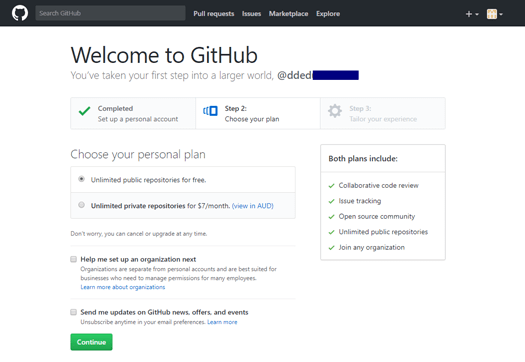 I chose the “Unlimited public repositories for free” option and pressed the Continue button.