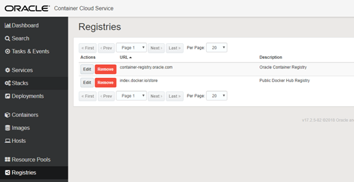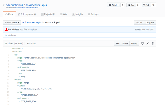 The occs-stack.yml file was included in the ankimedrec-apis repository as it defines the stack (web application service and mongodb database service) that will need to be deployed to OCCS. Services and Stacks need to pulled from a Registry in order for you to be able to deploy the image. An example registry definition for Docker Hub registry is included in the OCCS instance when it is created, but you will create a registry definition to Docker Hub using your Docker Hub credentials.