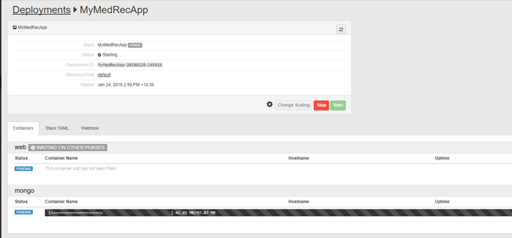 Once the containers have successfully started for both mongo and the web application tier then you will see a green RUNNING indicator on the screen.