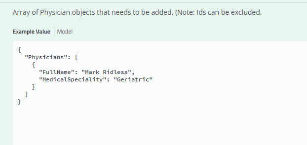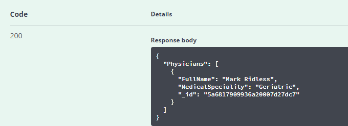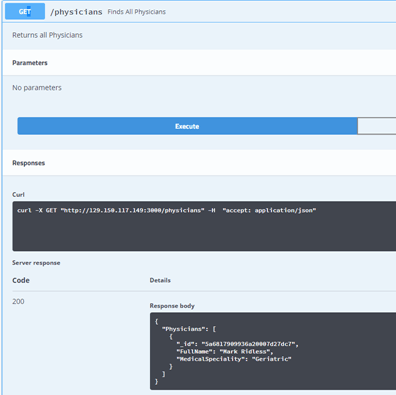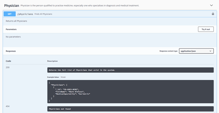 Click the Blue GET button adjacent to /physicians, we will execute this to return any Physicians that have been created and stored within MongoDB.